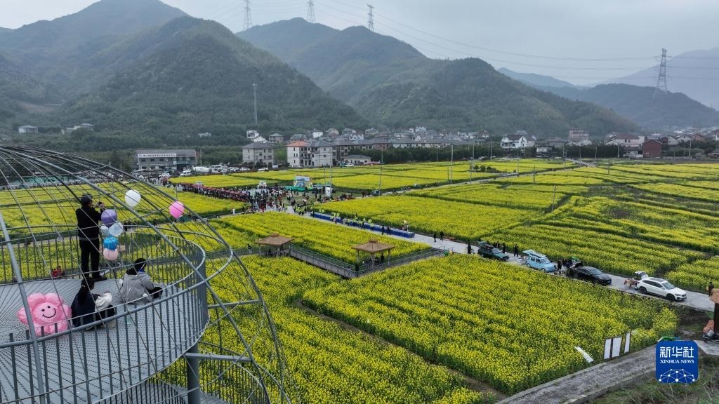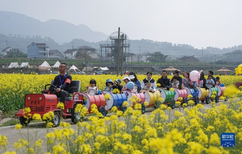 在浙江杭州臨安區(qū)青山湖街道郎家村“共富稻田”,游客乘坐田野小火車(chē)在油菜花地里感受春日美景(4月1日攝)?!肮哺坏咎铩倍ㄎ欢喙δ芴飯@農(nóng)旅綜合體,陸續(xù)打造了妙哉花園、稻田觀光道、稻田餐廳、稻田茶吧等鄉(xiāng)村旅游特色節(jié)點(diǎn),吸引城市居民前來(lái)體驗(yàn)戶(hù)外農(nóng)田生活。新華社記者 徐昱 攝