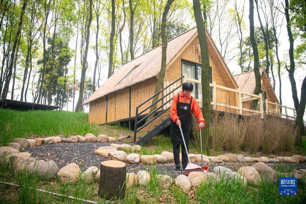 浙江諸暨楓橋鎮(zhèn)陽(yáng)春村村民在一家度假村內(nèi)工作(3月29日攝)。當(dāng)?shù)赝ㄟ^(guò)閑置荒山土地流轉(zhuǎn)發(fā)展鄉(xiāng)村旅游,幫助陽(yáng)春村60名村民實(shí)現(xiàn)在家門(mén)口就業(yè)增收。新華社記者 黃宗治 攝