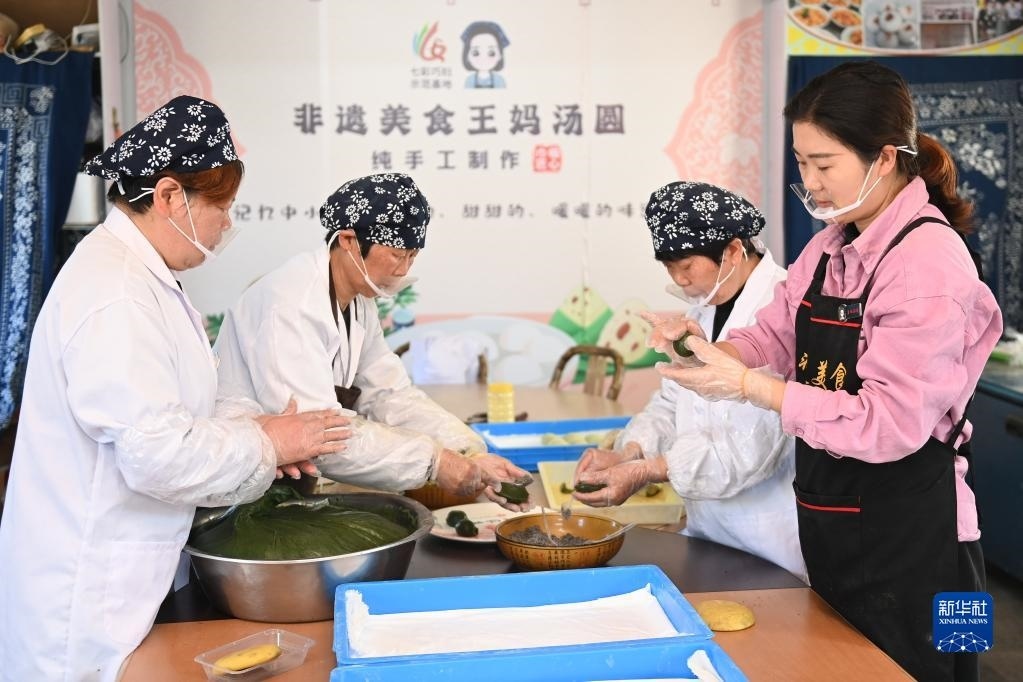 在浙江寧波奉化區(qū)西塢街道廟后周村,毛美兒(右一)與村民一同制作青團(tuán)(3月8日攝)。自2015年創(chuàng)業(yè)起,“王媽湯圓”負(fù)責(zé)人毛美兒將制作本地非遺美食的技藝傳授給當(dāng)?shù)貗D女,已帶動(dòng)60余位農(nóng)村婦女制作、銷(xiāo)售美食,共同增收致富。新華社記者 黃宗治 攝