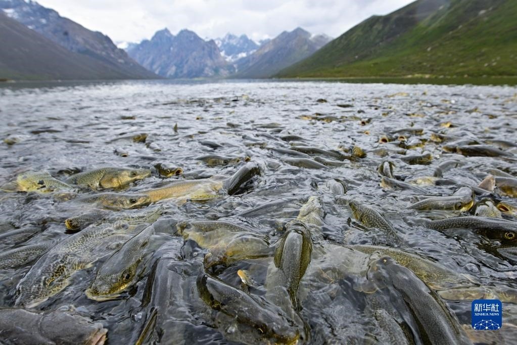 6月11日,在青海省果洛藏族自治州久治縣境內的年保玉則,裸鯉在水中活動。