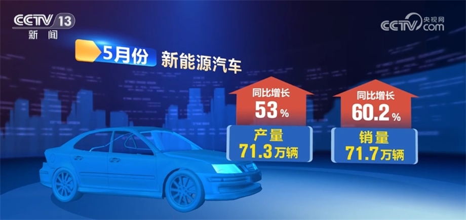 其中,新能源汽車產(chǎn)銷量分別完成71.3萬(wàn)輛和71.7萬(wàn)輛,同比分別增長(zhǎng)53%和60.2%,市場(chǎng)占有率達(dá)到30.1%。在出口方面,5月份,全國(guó)汽車出口38.9萬(wàn)輛,同比增長(zhǎng)58.7%。