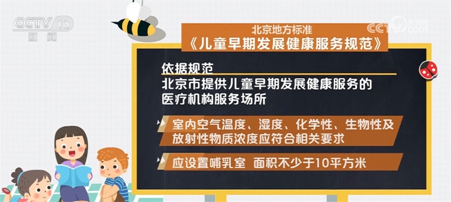 依據(jù)規(guī)范,北京市提供兒童早期發(fā)展健康服務的醫(yī)療機構(gòu)服務場所應遠離各種污染源,采光充足,通風良好,遠離噪聲與電磁干擾;設置防蚊、蟲、蠅、鼠等設備,并放置于兒童無法接觸到的地方;室內(nèi)空氣溫度、濕度、化學性、生物性及放射性物質(zhì)濃度應符合相關要求。應設置哺乳室,面積不少于10平方米;設置幼兒專用便器、洗手池等衛(wèi)生設施;服務設施應光滑、牢固,無尖銳棱角、鋒利切面、毛邊、倒刺、零件脫落、繩索等安全隱患。