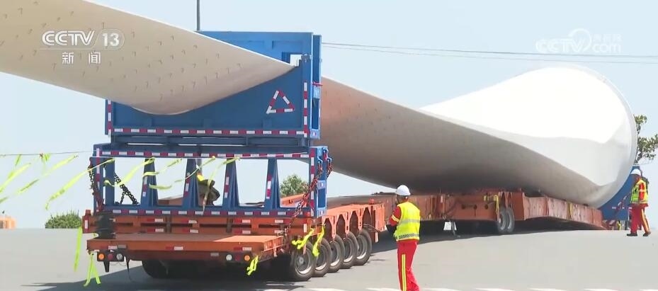 央視網(wǎng)消息:今天(6月14日)上午,100%我國自主知識(shí)產(chǎn)權(quán)的123米超長海上風(fēng)電葉片在江蘇連云港啟動(dòng)陸地轉(zhuǎn)運(yùn)工作。上午9時(shí),代表著我國風(fēng)電裝備最新技術(shù)水準(zhǔn)的大葉片,從廠區(qū)到港口碼頭,陸地運(yùn)輸全程約30公里,耗時(shí)約3到4個(gè)小時(shí),其中運(yùn)輸大葉片的車輛還要拐過90度的直角彎。如此大體量的裝備運(yùn)輸是一個(gè)復(fù)雜的過程,其中有哪些技術(shù)難點(diǎn)?來看記者今天上午從現(xiàn)場(chǎng)發(fā)回的報(bào)道。