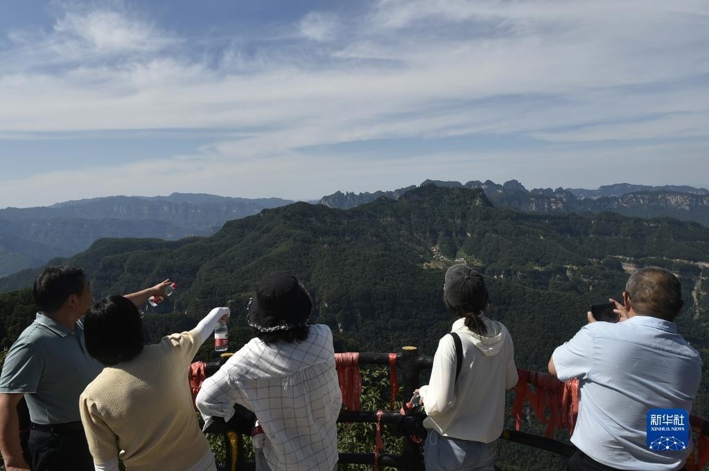 6月15日,游人在王屋山的一處觀景臺(tái)上賞景拍照。