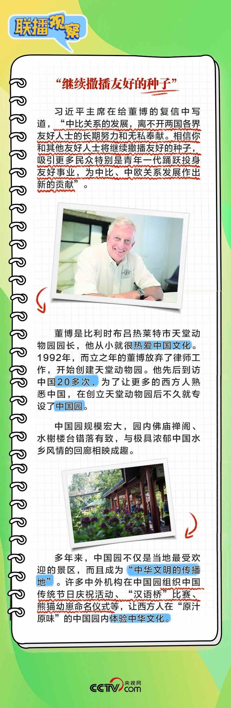 董博是比利時布呂熱萊特市天堂動物園園長,他在給習(xí)主席致信中回顧了習(xí)主席和夫人彭麗媛2014年3月訪比期間出席天堂動物園大熊貓園開園儀式的情景,表示中國園體現(xiàn)人與自然和諧共生理念,中國夢和中國的發(fā)展繁榮永遠(yuǎn)是可共享的機(jī)遇。