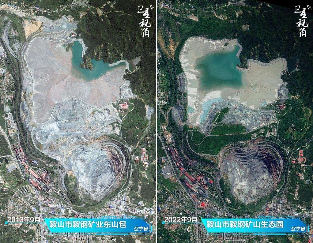 ↑2022年與2013年相比,曾經塵土飛揚的鞍鋼礦山,如今蛻變?yōu)闈M眼綠意的生態(tài)園。