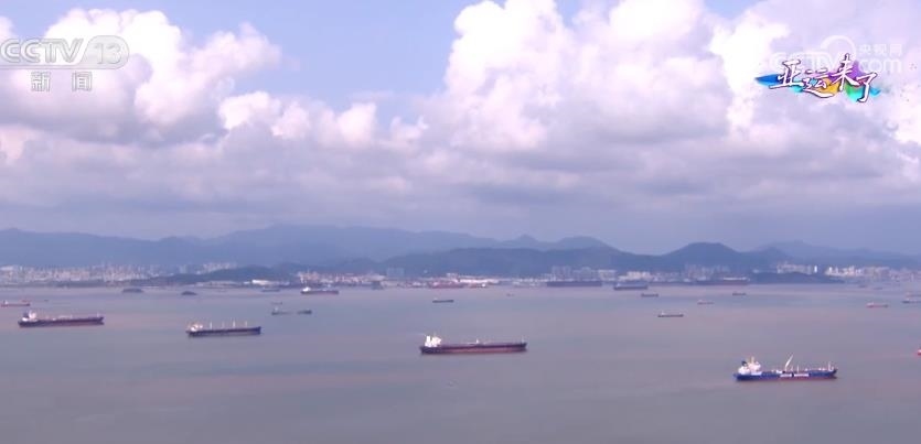 我們飛越兩座亞運(yùn)場館,將要看到的就是寧波最閃亮的名片之一:寧波舟山港。繁忙是這座港口的常態(tài)。當(dāng)我們的直升機(jī)遠(yuǎn)遠(yuǎn)地飛行,還沒有靠近港口的時候,就能先看到港口外的這片海域——洋小貓水域,這里是船舶經(jīng)南航道進(jìn)出寧波舟山港核心港區(qū)的一條必經(jīng)之路。向下看,大家可以看到海面上星星點(diǎn)點(diǎn)的船只,來自全球各地滿載商品貨物的遠(yuǎn)洋船舶在這里交匯。