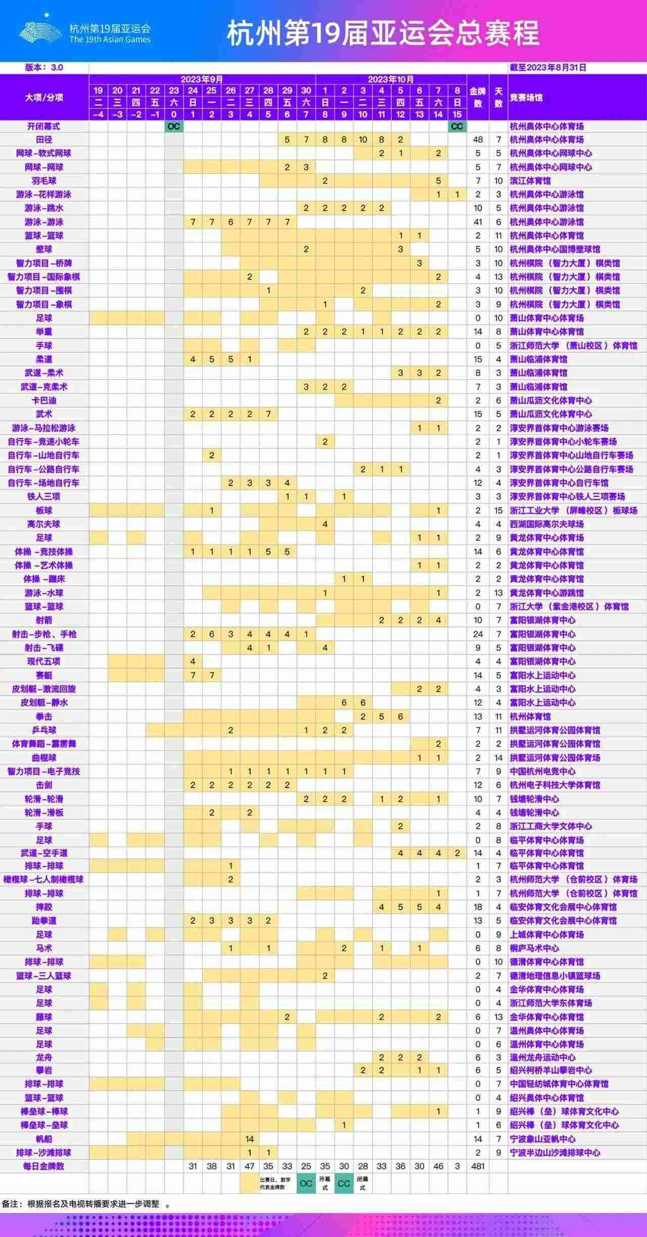 根據(jù)最新報(bào)名調(diào)整情況,經(jīng)杭州亞運(yùn)會各項(xiàng)目技術(shù)代表確認(rèn),杭州亞運(yùn)會總賽程已更新至3.0版。
