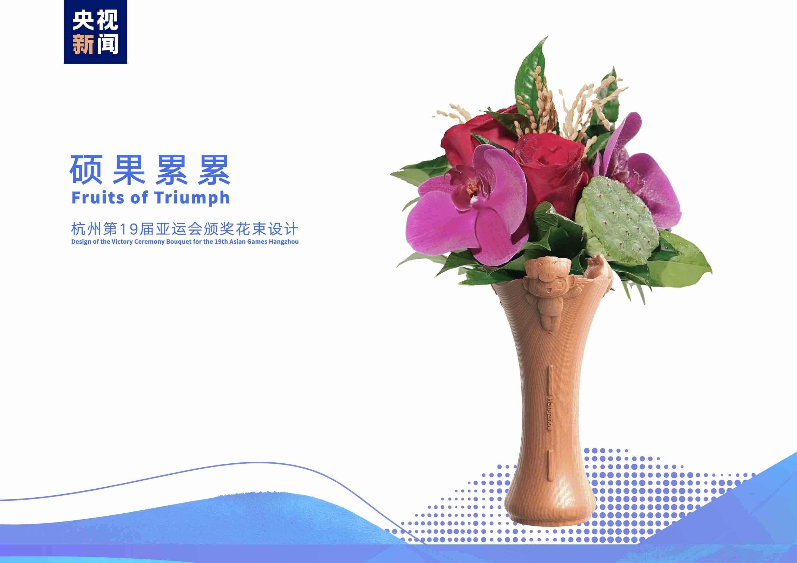 頒獎(jiǎng)花束名為“碩果累累”,花材以寓意豐收和成果的稻穗和蓮蓬,名為“赤子之心”的中國自育品種月季,代表亞運(yùn)“虹韻紫”的蝴蝶蘭,以及杭州特色植物龍井茶枝和桂花枝等組成,展現(xiàn)杭州獨(dú)特的文化內(nèi)涵和城市魅力。