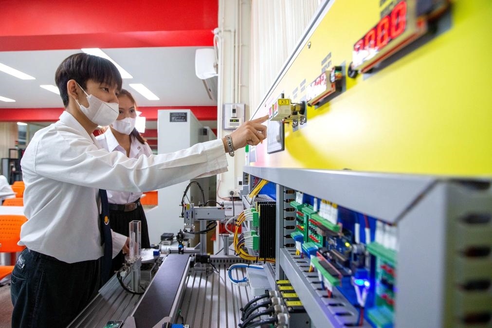 3月14日,在泰國大城府大城技術(shù)學(xué)院魯班工坊,學(xué)生在課堂上操作自動化生產(chǎn)線安裝調(diào)試系統(tǒng)。新華社記者 王騰 攝