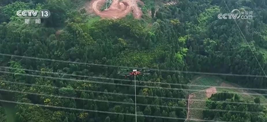 在施工現(xiàn)場,工作人員操作無人機,帶著牽引繩緩緩升空,在140米的高空,帶動重量達到6噸的導(dǎo)線,緩緩跨過500千伏嘉林線上空,最終架設(shè)在兩基170多米高、間距400米的鐵塔間。