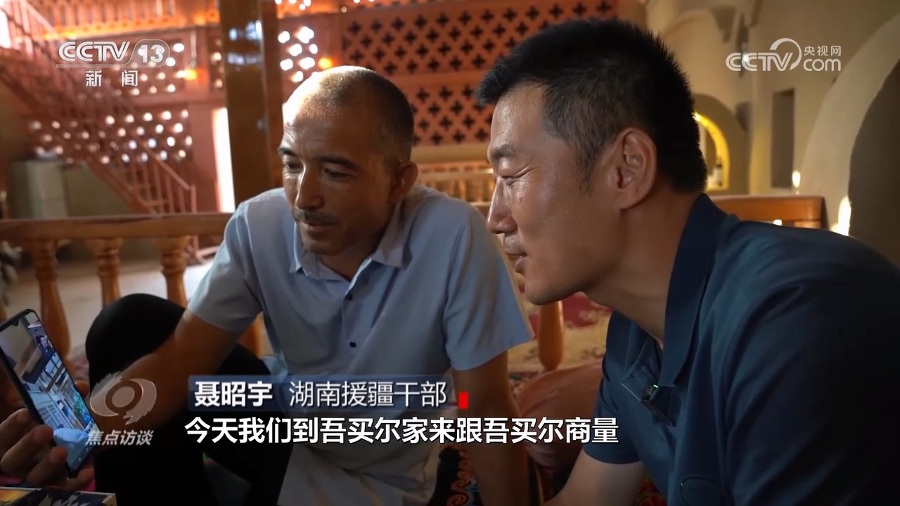 湖南援疆干部聶昭宇:“今天我們到吾買爾家跟吾買爾商量,在他們門前搞一個(gè)電商帶貨大比拼,現(xiàn)在這個(gè)村每天來(lái)了不少人,我們覺(jué)得前景挺好。”