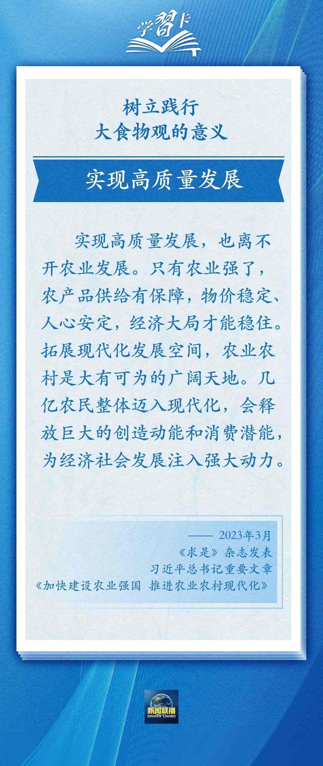 今年4月,總書記在廣東湛江考察時(shí)指出,要樹立大食物觀,既向陸地要食物,也向海洋要食物。前不久,總書記主持召開新時(shí)代推動(dòng)?xùn)|北全面振興座談會(huì)強(qiáng)調(diào),踐行大食物觀,把農(nóng)業(yè)建成大產(chǎn)業(yè)。