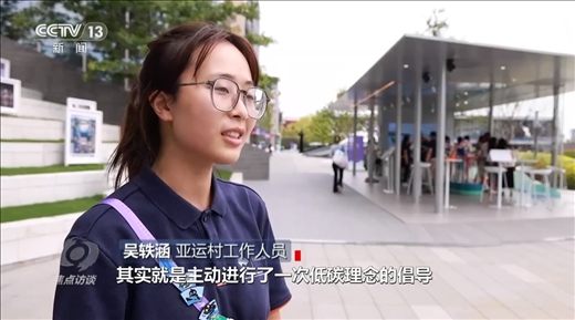 亞運(yùn)村工作人員吳軼涵:“徽章交換中心建筑本身就是以低碳的材料制作而成的,同時也制作了以低碳材料而制作的徽章,這些徽章給運(yùn)動員交換使用。所以每次在這里完成一次徽章交換其實(shí)就是主動進(jìn)行了一次低碳理念的倡導(dǎo)?!?/p>
