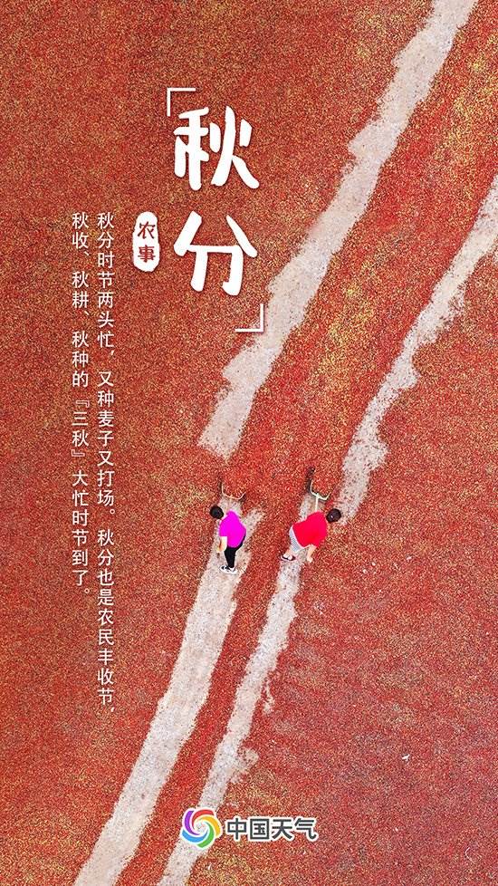中國天氣網(wǎng)訊 “金氣秋分,風(fēng)清露冷秋期半。”今天(9月23日)我國迎來了秋分節(jié)氣。秋分是秋季的第四個節(jié)氣,天高云淡,桂蕊飄香,秋風(fēng)拂過,送來豐收的味道,農(nóng)田里滿是忙碌的身影。秋分也是農(nóng)民豐收節(jié),中國天氣網(wǎng)推出常年秋分節(jié)氣期間全國秋收地圖,看哪里五谷豐登、農(nóng)事繁忙。