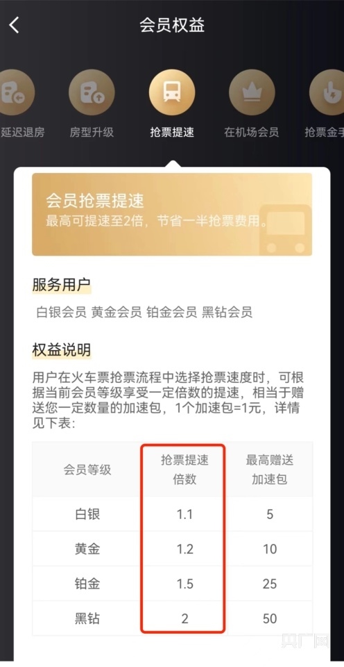 記者發(fā)現(xiàn),在另一個第三方購票平臺,會員分為普通、白銀、黃金、鉑金、黑鉆等不同等級,不同等級享受不同權(quán)益。從搶票提速這一權(quán)益來看,普通會員并未享受搶票提速這一權(quán)益,而白銀到黑鉆會員的搶票速度則依次提高1.1倍、1.2倍、1.5倍、2倍。