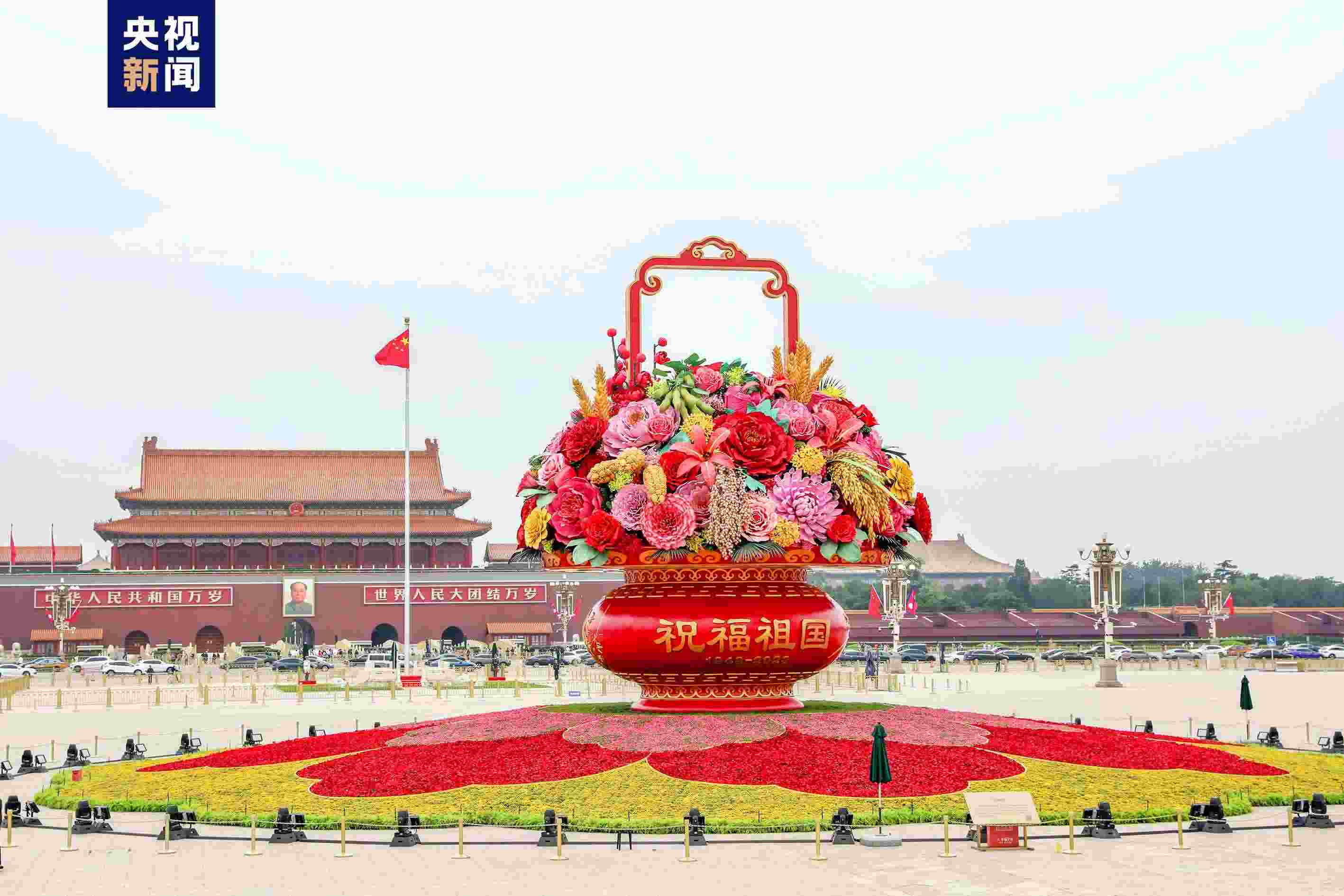 “祝福祖國”巨型花籃亮相 天安門廣場和長安街沿線國慶花卉布置完工