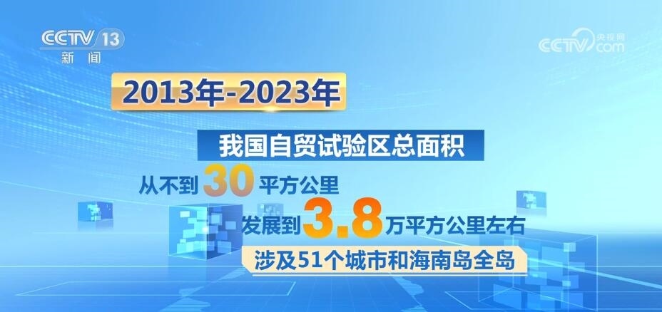 十年間,我國(guó)自貿(mào)試驗(yàn)區(qū)的總面積從不到30平方公里發(fā)展到3.8萬平方公里左右,涉及51個(gè)城市和海南島全島。今年上半年,我國(guó)自貿(mào)試驗(yàn)區(qū)以不到千分之四的國(guó)土面積,實(shí)現(xiàn)了占全國(guó)18.4%的外商投資和18.6%的進(jìn)出口總額,帶動(dòng)全國(guó)形成了覆蓋東西南北中、統(tǒng)籌沿海內(nèi)陸沿邊的改革開放創(chuàng)新格局。