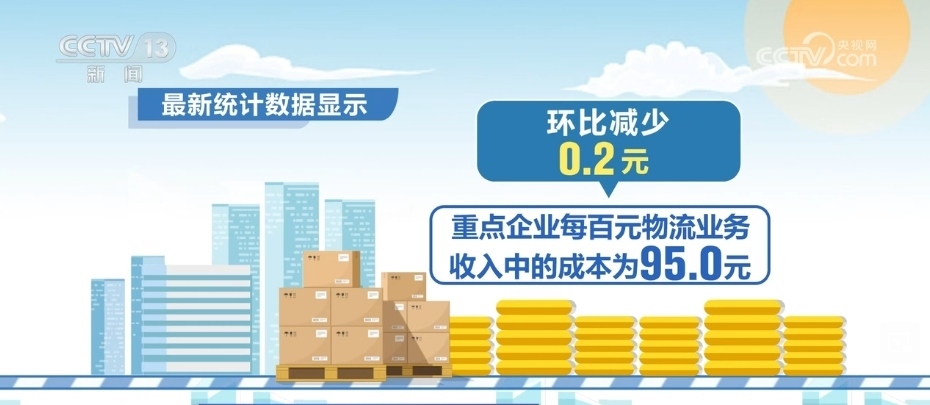 據介紹,近期,上游原材料價格趨緩,物流企業(yè)經營成本壓力略有緩解。最新統(tǒng)計數據顯示,重點企業(yè)每百元物流業(yè)務收入中的成本為95.0元,環(huán)比減少0.2元。