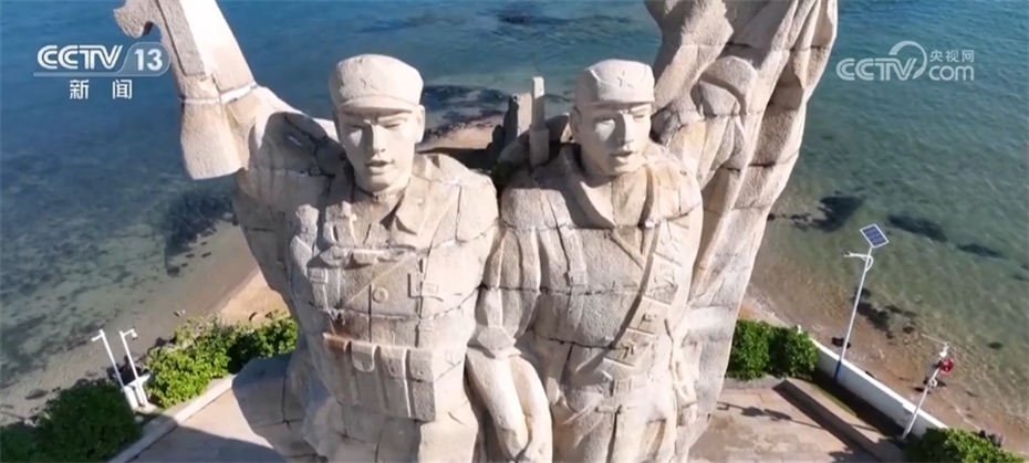 跟隨鏡頭,我們來到位于海南臨高縣北部海岸的海南解放公園,這里是解放海南渡海登陸戰(zhàn)主要登陸點(diǎn)之一。藍(lán)天碧海間,屹立著熱血豐碑紀(jì)念雕像,兩個(gè)戰(zhàn)士手拉著手,勝利吶喊,象征人民解放軍在瓊崖革命力量的大力配合下,創(chuàng)造戰(zhàn)爭(zhēng)史上“木船打軍艦”渡海作戰(zhàn)的壯舉。軍民共建,英勇無畏。