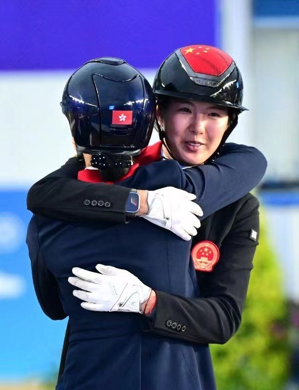 在桐廬馬術(shù)中心進(jìn)行的杭州亞運(yùn)會(huì)馬術(shù)比賽盛裝舞步團(tuán)體賽頒獎(jiǎng)儀式上,獲得亞軍的中國(guó)隊(duì)隊(duì)員饒嘉怡(右)與獲得季軍的中國(guó)香港隊(duì)隊(duì)員蕭穎瑩相互擁抱祝福(9月26日攝)