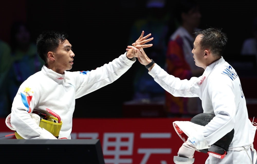 ?9月26日,中國(guó)選手王子杰(右)在男子個(gè)人重劍八分之一決賽賽后與菲律賓選手諾埃利托·何塞致意。