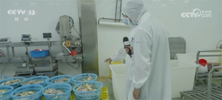 總臺(tái)央視記者 馬寧:我現(xiàn)在來(lái)到了寧德市當(dāng)?shù)匾患冶容^大的黃魚(yú)生產(chǎn)企業(yè),大家可以看到我身后就是工人們正在把已經(jīng)腌制好的黃魚(yú)經(jīng)過(guò)分撿、稱重、打包、送進(jìn)冷庫(kù),這些經(jīng)過(guò)處理的大黃魚(yú)就可以通過(guò)冷鏈物流送到千家萬(wàn)戶的餐桌上。