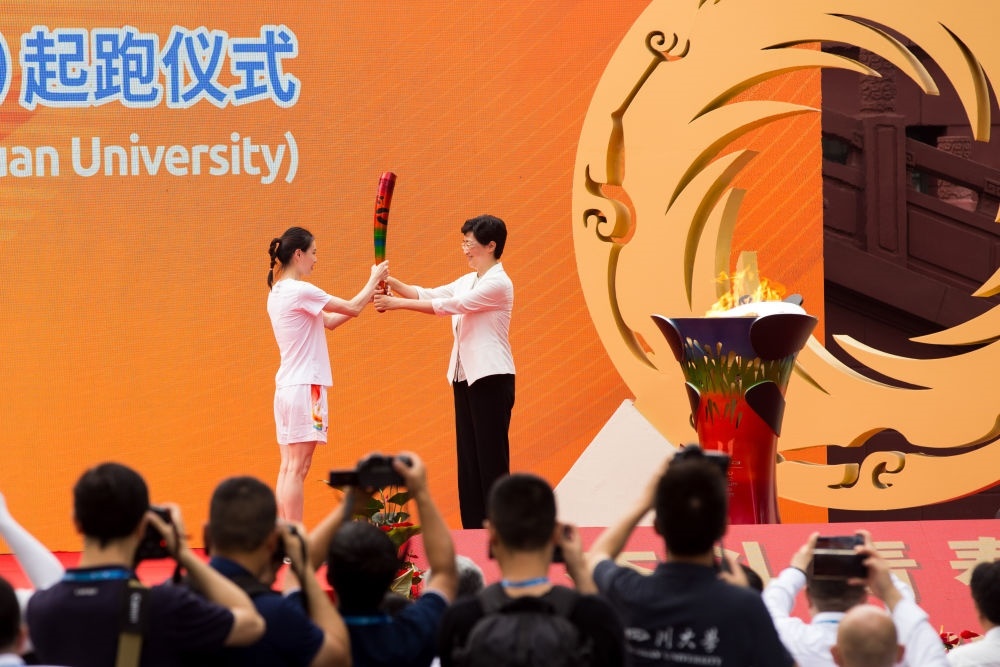 7月2日,第一棒火炬手吳敏霞(左)接過點燃的火炬。當日,成都第31屆世界大學生夏季運動會火炬?zhèn)鬟f成都站起跑儀式在四川大學校園內舉行。新華社發(fā)(曹鵬攝)