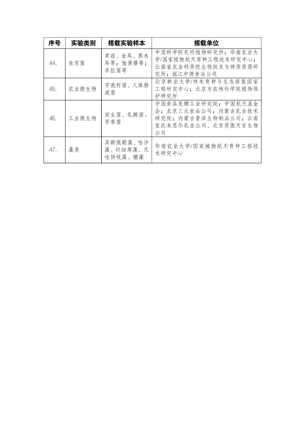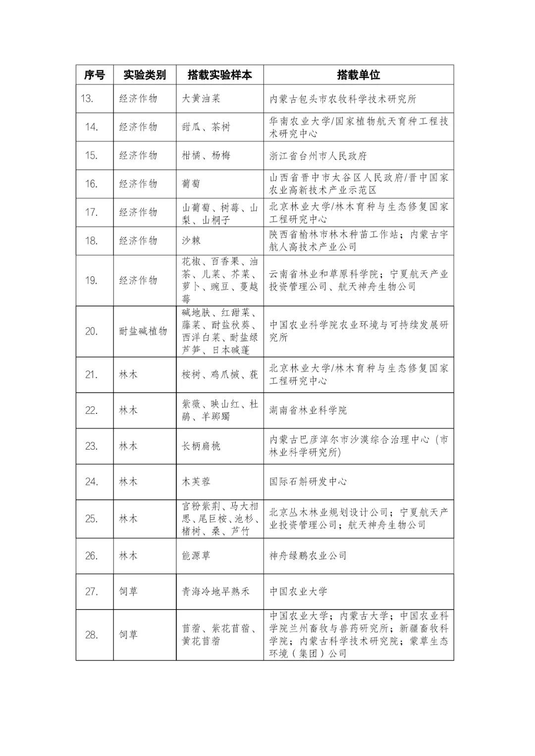 載人航天工程立項實施以來,始終注重提升工程綜合效益,致力服務國家經(jīng)濟社會發(fā)展。在工程歷次飛行任務中,均安排了航天育種搭載實驗項目。從神舟十六號載人飛船開始,中國載人航天工程辦公室向社會公開征集航天育種搭載實驗項目,于3月23日在工程官網(wǎng)發(fā)布《關于征集神舟系列載人飛船航天育種實驗項目的機會公告》,同時在工程官網(wǎng)開辟“航天育種搭載實驗”管理平臺,接受搭載需求單位申報實驗項目。辦公室組織專家對申報項目進行評審,遴選出53個單位的136種份航天育種實驗材料實施搭載。包括農(nóng)作物47份(糧食作物種子12份、經(jīng)濟作物種子28份、耐鹽堿植物7份);林草、花卉和藥用植物76份(林木17份、飼草21份、花卉7份、藥用植物31份);微生物和其它13種(農(nóng)業(yè)微生物菌種2種、工業(yè)微生物菌種3種、食用菌3種、藻類和苔蘚5種)(清單附后)。