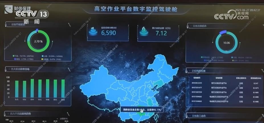 在湖南這家金融機(jī)構(gòu)的大屏幕上,一個(gè)個(gè)小點(diǎn)組成了全國(guó)6500多臺(tái)高空作業(yè)設(shè)備的實(shí)時(shí)運(yùn)行數(shù)據(jù)圖。動(dòng)動(dòng)手指,生產(chǎn)的每臺(tái)設(shè)備的地理位置、開機(jī)狀態(tài)和運(yùn)行情況等數(shù)據(jù)都清晰可見。