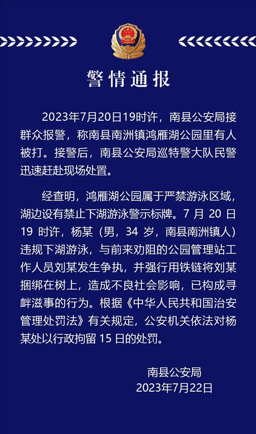·男子下湖游泳違規(guī)、將勸阻人員鎖在樹上,湖南益陽市南縣警方通報。