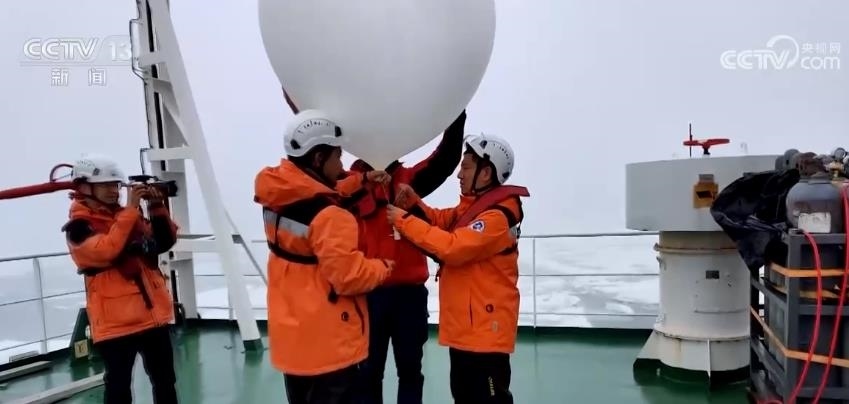 在“雪龍2”號(hào)的9層甲板,大氣環(huán)境組的科考隊(duì)員們正在為氣象探空氣球充氣,這個(gè)氣球?qū)y帶無(wú)線(xiàn)電探空儀,飛到兩三萬(wàn)米的高空,探測(cè)大氣自下而上的溫度、濕度、氣壓、風(fēng)向、風(fēng)速等數(shù)據(jù)。