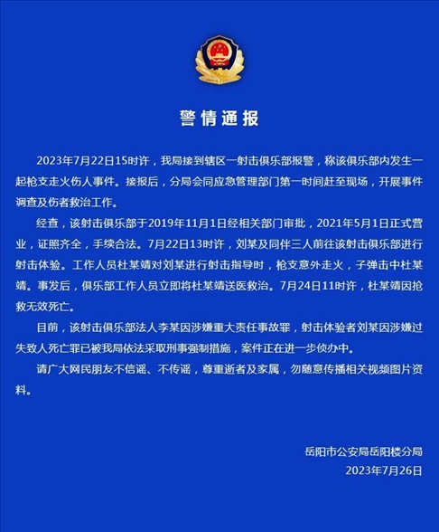 ·岳陽警方通報一俱樂部槍支走火致工作人員死亡事件。