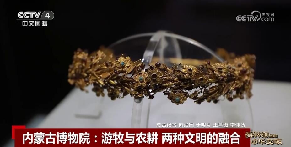總臺(tái)記者 于明月:這里是位于呼和浩特市的內(nèi)蒙古博物院。從外觀上就能看出,這座建筑的設(shè)計(jì)靈感就來(lái)自于草原。它整體造型的寓意是美麗遼闊的草原上矗立著刻滿(mǎn)年輪的氈包,旁邊蜿蜒的小路象征著草原從幽深的遠(yuǎn)古走來(lái),又向美好的未來(lái)走去。兩側(cè)舒展的飄蓬代表著草原上圣潔的哈達(dá),迎接八方來(lái)客。這座博物院里面收藏有古生物化石、歷史文物、民族民俗文物15萬(wàn)余件,在眾多文物之中如果要說(shuō)出一件鎮(zhèn)館之寶,大家一定會(huì)想到“鷹頂金冠飾”。