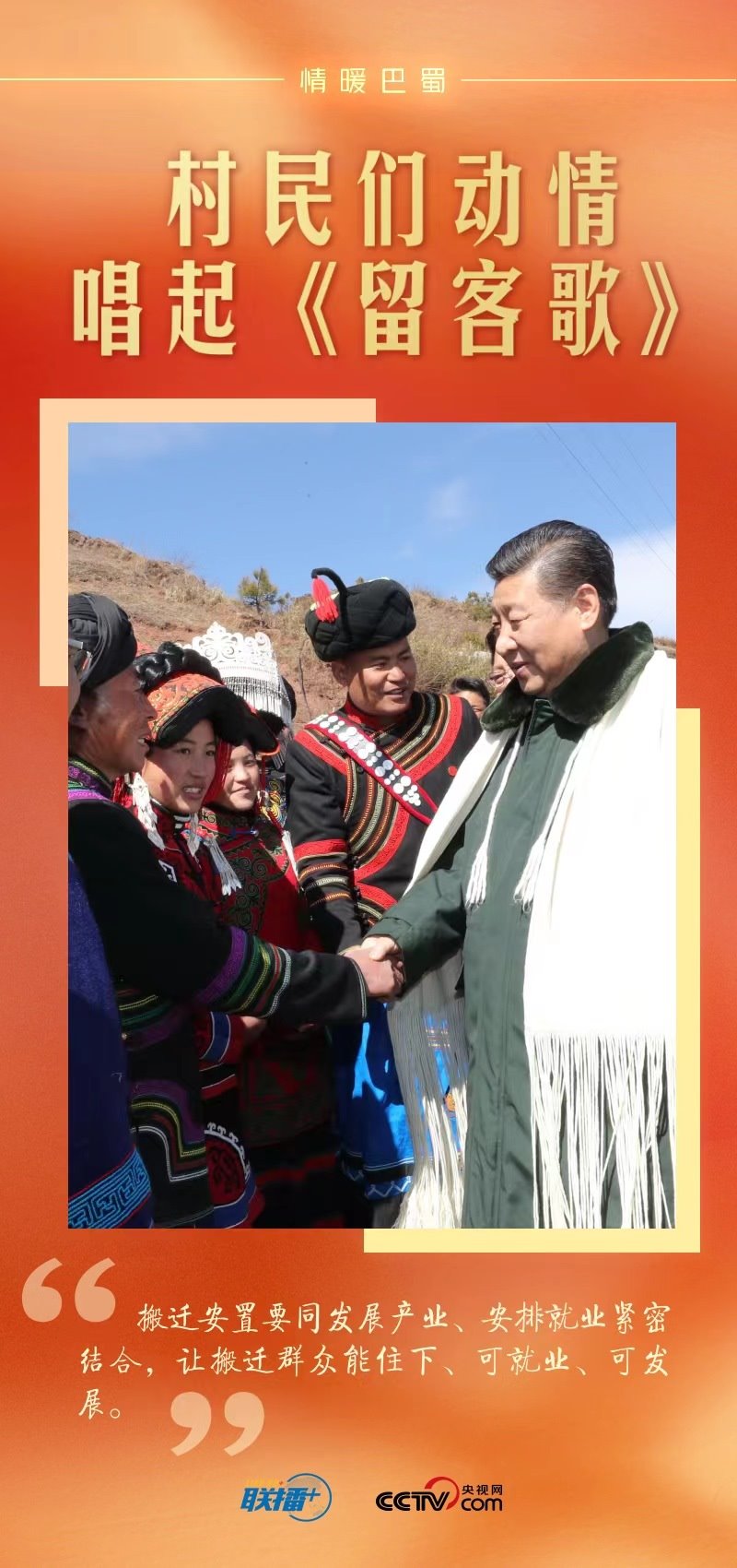總書記離開村子時,身著彝族盛裝的鄉(xiāng)親們排起長隊。村黨支部書記代表全村人向總書記獻上彝族傳統(tǒng)服飾查爾瓦,表達對總書記的愛戴之情。人群中有人唱起彝族民歌《留客歌》,鄉(xiāng)親們都跟著唱起來……掌聲、歌聲、歡呼聲在村子里久久回蕩。