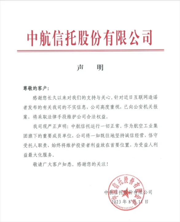 中航信托股份有限公司(下稱“中航信托”)在微信官方公眾號發(fā)文回應(yīng)稱,“針對近日互聯(lián)網(wǎng)造謠者發(fā)布的有關(guān)我司的不實信息,公司高度重視,已向公安機關(guān)報案,將采取法律手段維護公司合法權(quán)益。我司現(xiàn)嚴(yán)正聲明:中航信托運行一切正常。作為航空工業(yè)集團旗下的重要成員單位,公司將一如既往地堅持誠信經(jīng)營,恪守受托人職責(zé),始終將維護投資者利益放在首要位置,為受益人利益最大化服務(wù)?!?/p>