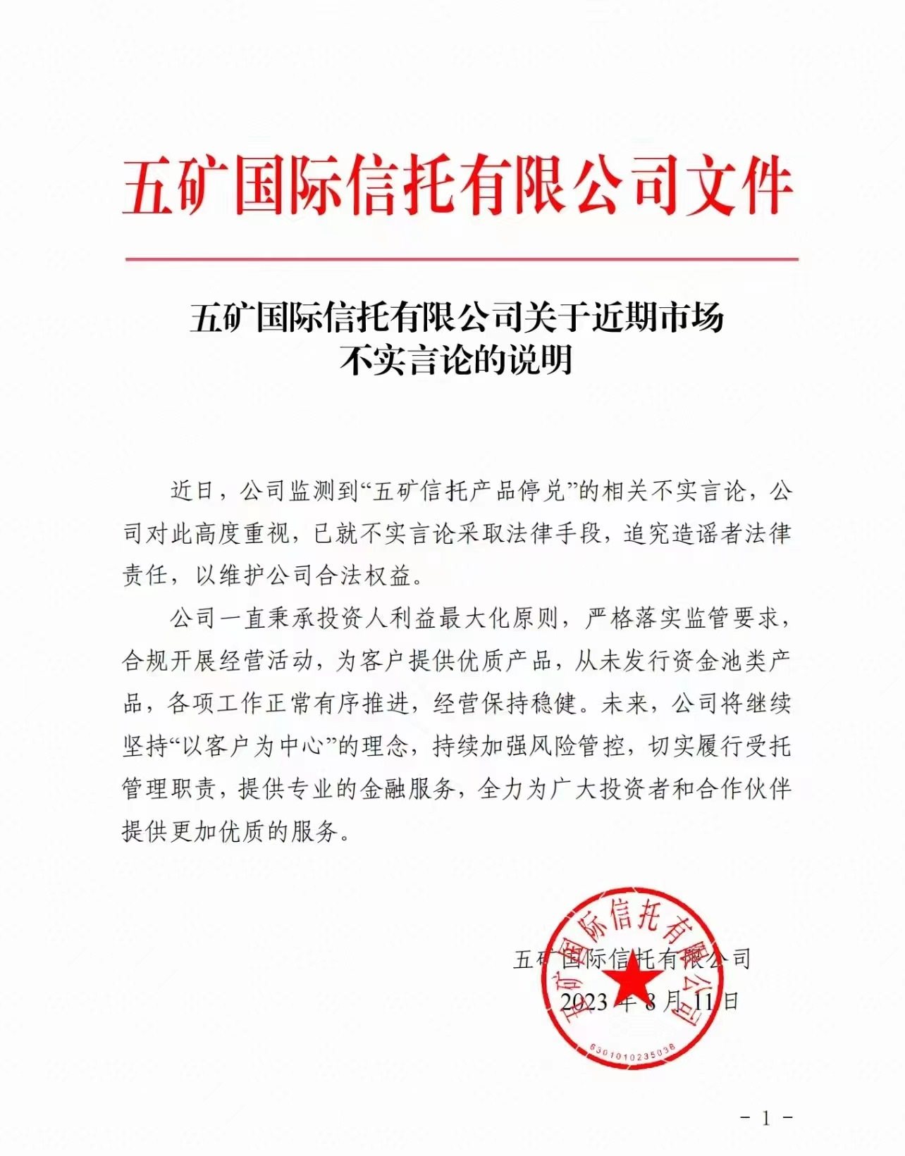 五礦國際信托有限公司(下稱“五礦信托”)發(fā)布聲明稱,近日,公司監(jiān)測到“五礦信托產(chǎn)品停兌”的相關(guān)不實言論,公司對此高度重視,已就不實言論采取法律手段,追究造謠者法律責(zé)任,以維護公司合法權(quán)益。公司一直秉承投資人利益最大化原則,嚴(yán)格落實監(jiān)管要求,合規(guī)開展經(jīng)營活動,為客戶提供優(yōu)質(zhì)產(chǎn)品,從未發(fā)行資金池類產(chǎn)品,各項工作正常有序推進,經(jīng)營保持穩(wěn)健。