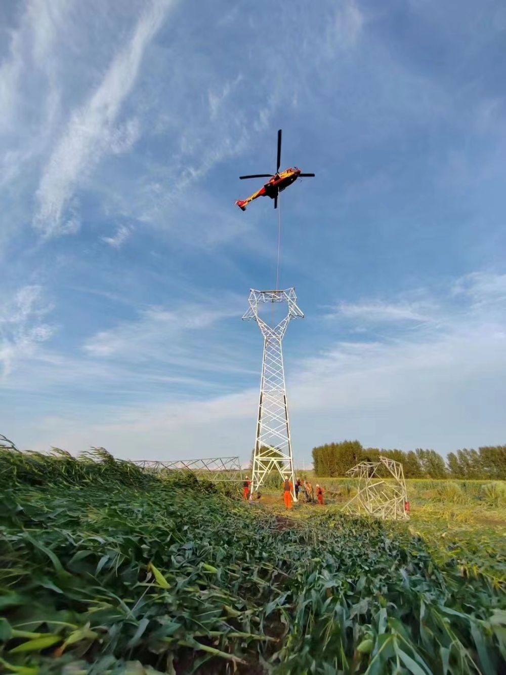 9日,在海林市110千伏長(zhǎng)海輸電線路搶修現(xiàn)場(chǎng),一架直升機(jī)吊裝起沉重的輸電鐵塔,運(yùn)送到指定地點(diǎn)。這個(gè)輸電鐵塔處于河流中心島位置,無法使用常規(guī)起重設(shè)備。國(guó)家電網(wǎng)公司迅速?gòu)膰?guó)網(wǎng)遼寧電力、國(guó)網(wǎng)空間技術(shù)公司等單位調(diào)配直升機(jī)支援黑龍江,解決輸電鐵塔吊裝、運(yùn)輸?shù)葐栴}。