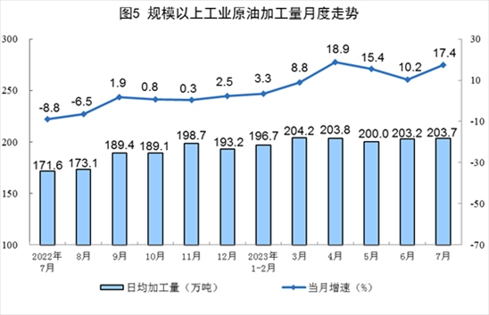 原油加工增速加快。7月份,加工原油6313萬(wàn)噸,同比增長(zhǎng)17.4%,增速比6月份加快7.2個(gè)百分點(diǎn),日均加工原油203.7萬(wàn)噸。1—7月份,加工原油42671萬(wàn)噸,同比增長(zhǎng)10.9%。