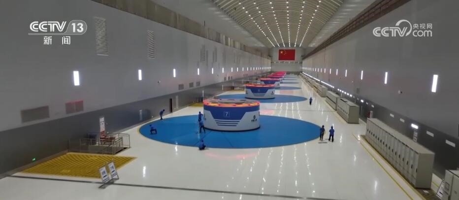 我現(xiàn)在就在白鶴灘水電站的左岸地下廠房,在我身后一字排開(kāi)的,就是處于全發(fā)狀態(tài)當(dāng)中的百萬(wàn)千瓦水輪發(fā)電機(jī)組。站在這兒,我其實(shí)只能看到它冒出地面的3米,而在我腳下還有51米,單臺(tái)機(jī)組的總重量接近8000噸。之所以讓它成為世界級(jí)的先進(jìn)的水輪發(fā)電機(jī)組,除了它的這種大體量和大功率之外,更重要的是在研發(fā)階段解決了許多世界級(jí)的難題。比如,它所克服的特殊工況下的壓力脈動(dòng),就能夠讓整臺(tái)機(jī)組在運(yùn)行的時(shí)候更加的安全、穩(wěn)定。再比如說(shuō),在機(jī)組高速運(yùn)轉(zhuǎn)的過(guò)程當(dāng)中,對(duì)于平穩(wěn)性的要求近乎于苛刻,我現(xiàn)在就站在機(jī)組的頂板上,在地面上立了幾枚硬幣,它們現(xiàn)在是穩(wěn)穩(wěn)地立在這兒,但是如果我輕輕的施加外力,它就會(huì)傾倒,看得出來(lái)它的平穩(wěn)性。而正是一代又一代的中國(guó)水電人的不斷努力,才實(shí)現(xiàn)了水輪發(fā)電機(jī)組從跟跑到并跑到超越的發(fā)展速度。鑄造出了這樣的國(guó)之重器。