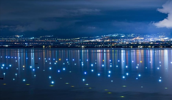 云南大理洱海湖面上,星星點(diǎn)點(diǎn)的漁燈點(diǎn)亮湖面,宛若繁星灑落,如夢似幻。