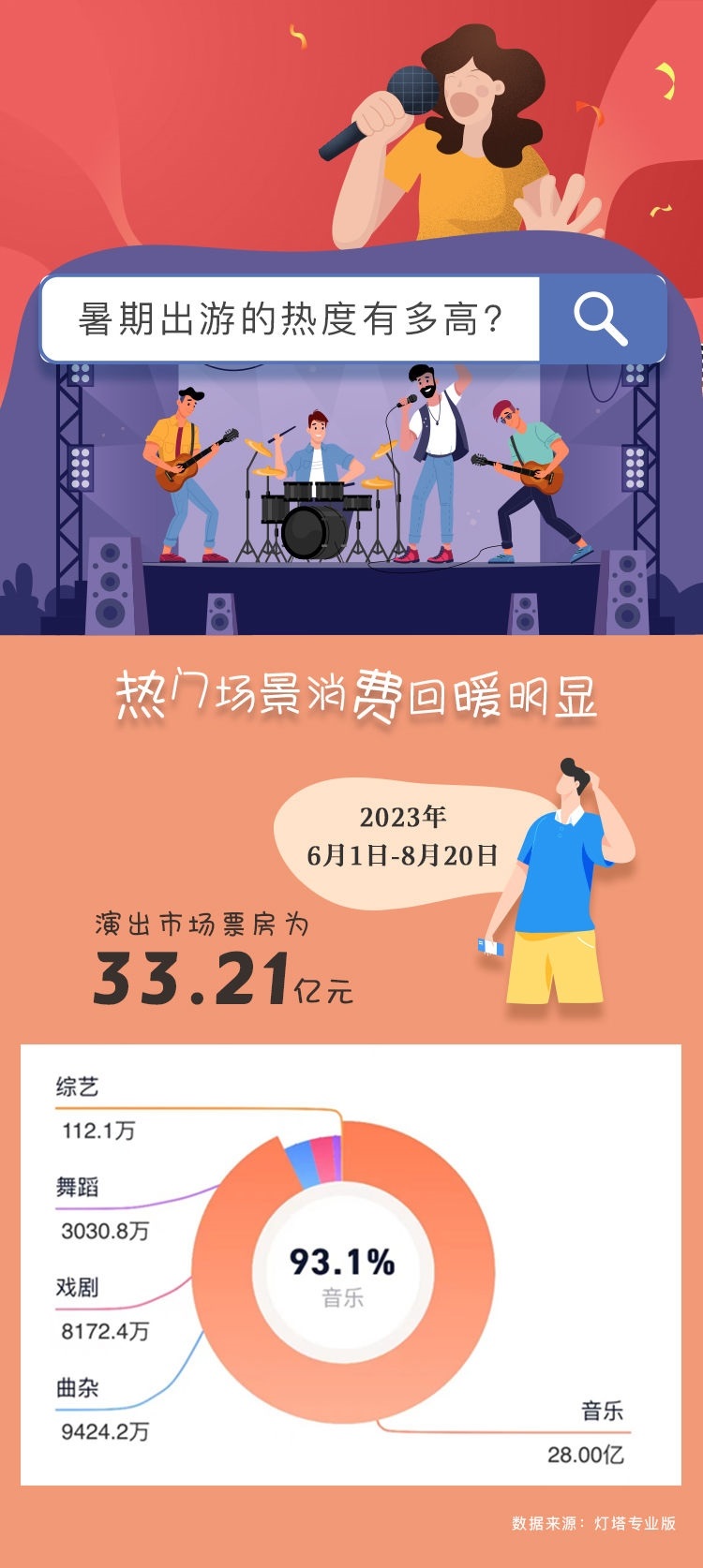 作為演出市場(chǎng)的傳統(tǒng)旺季,暑假期間演唱會(huì)、Live house、戲劇、音樂(lè)劇等各類熱門演出“一票難求”。根據(jù)燈塔專業(yè)版最新數(shù)據(jù),暑期檔中的6月1日至8月23日演出市場(chǎng)票房已經(jīng)超過(guò)30億元,而相當(dāng)可觀的跨城觀演比例,更引得除了演出票房之外的周邊產(chǎn)業(yè)一起火。“一個(gè)演出圈粉一座城”,當(dāng)?shù)芈糜谓?jīng)濟(jì)不斷涌現(xiàn)新的可能。