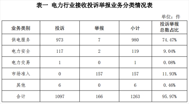 電力行業(yè)排在首位,數(shù)量為1263件、占投訴舉報(bào)總數(shù)的95.97%,主要集中在供電服務(wù)、市場準(zhǔn)入、電力安全等方面。