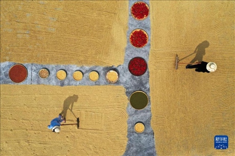 湖南省常寧市官嶺鎮(zhèn)中康村農(nóng)民在晾曬稻谷、辣椒等。