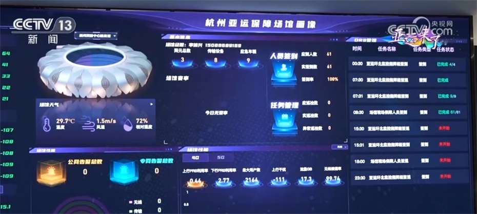 亞運(yùn)會(huì)場(chǎng)在技術(shù)創(chuàng)新上,會(huì)場(chǎng)可以滿足賽事期間數(shù)萬人同時(shí)使用4G、5G網(wǎng)絡(luò)收發(fā)視頻、圖片、撥打電話。當(dāng)局部用戶使用網(wǎng)絡(luò)數(shù)據(jù)上升的時(shí)候,場(chǎng)館內(nèi)的感知探針等設(shè)備會(huì)模擬和實(shí)時(shí)反饋上傳數(shù)據(jù),指揮中心屏幕上可以通過數(shù)據(jù)和紅橙黃綠四種顏色來判斷網(wǎng)速。工作人員能先于用戶,提前感知到網(wǎng)速變化并及時(shí)調(diào)度解決。