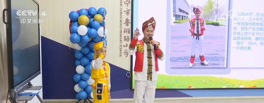 在南寧市魯班路小學(xué),同學(xué)們領(lǐng)略了獨(dú)具壯族特色的體育活動(dòng)《迪尺小課堂》。同學(xué)們還在開學(xué)典禮上身穿自己設(shè)計(jì)制作的扎染服飾,手拿親手制作的紅陶、皮影等非遺作品,表演了一場非遺秀。