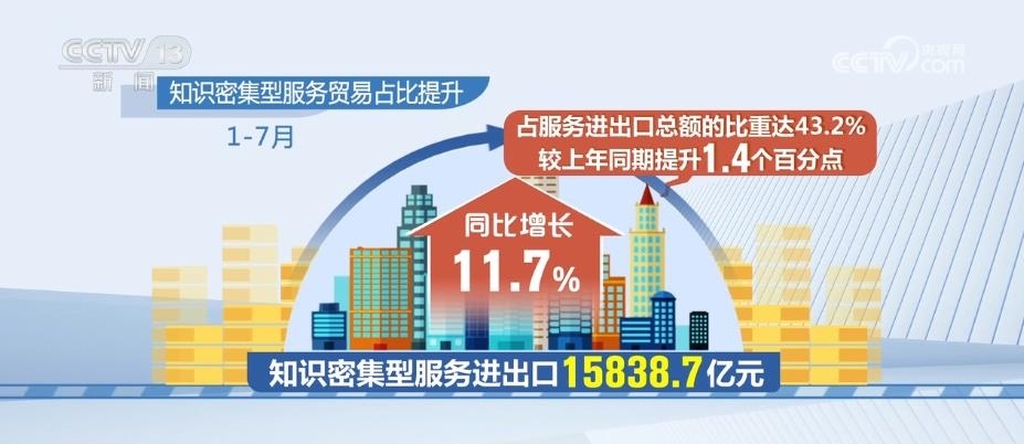 知識(shí)密集型服務(wù)貿(mào)易占比提升。1月—7月,知識(shí)密集型服務(wù)進(jìn)出口15838.7億元,同比增長(zhǎng)11.7%,占服務(wù)進(jìn)出口總額的比重達(dá)43.2%,較上年同期提升1.4個(gè)百分點(diǎn)。