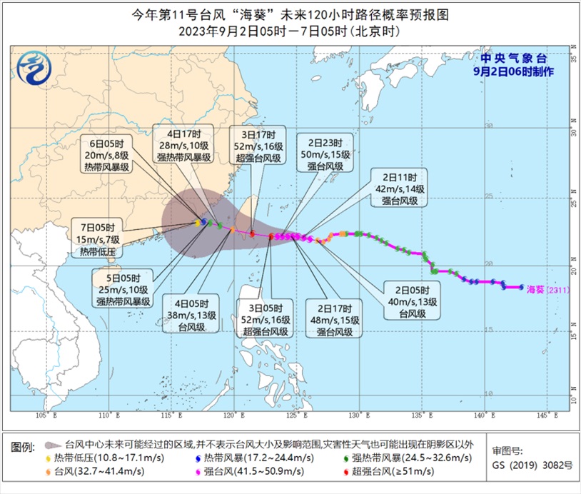 預(yù)計,“??睂⒁悦啃r15-20公里的速度向偏西方向移動,強度逐漸增強,最強可達強臺風級或超強臺風級(50-55米/秒,15-16級),將于3日傍晚前后在臺灣島東南部沿海登陸,然后穿過臺灣島,逐漸向福建南部到廣東東部沿??拷?。