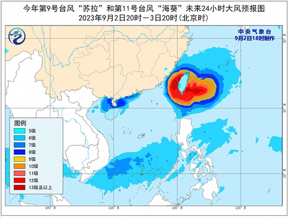 大風(fēng)預(yù)報(bào):9月2日20時(shí)至3日20時(shí),受“蘇拉”影響,廣東中西部沿海、廣西南部沿海、海南島北部沿海、珠江口及澳門(mén)等地將有6-7級(jí)大風(fēng),南海西北部、北部灣東部和瓊州海峽將有8級(jí)、陣風(fēng)9-10級(jí)的大風(fēng);受“??庇绊懀褪亢{南部、臺(tái)灣海峽西部、東海南部及釣魚(yú)島附近海域、浙江南部沿海、福建中北部沿海、臺(tái)灣島沿海將有6-8級(jí)、陣風(fēng)9-10級(jí)大風(fēng),巴士海峽北部、臺(tái)灣海峽東部、臺(tái)灣以東洋面及臺(tái)灣島南部沿海的風(fēng)力有9-12級(jí),陣風(fēng)13-14級(jí),“??敝行慕?jīng)過(guò)的附近海面或地區(qū)的風(fēng)力有13-16級(jí),陣風(fēng)17級(jí)。