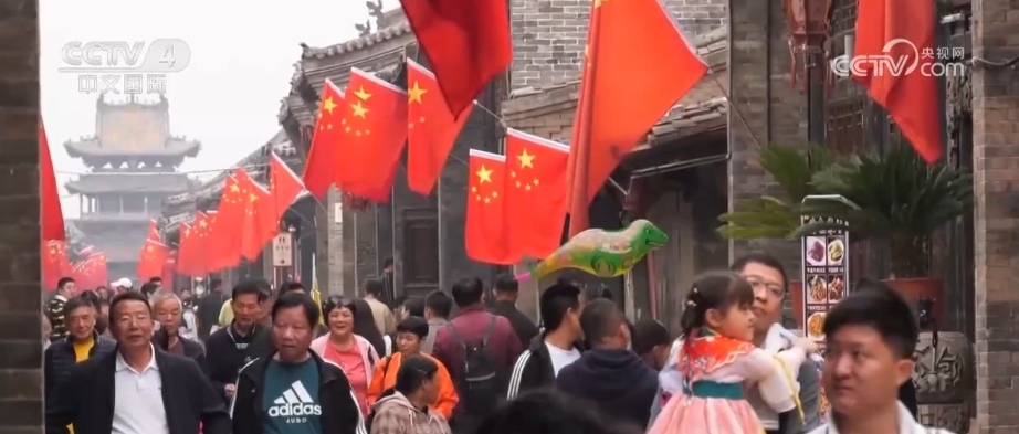 在山西平遙、廣西陽朔、江蘇泰州等地,一面面國旗熱烈醒目、一條條街道花團錦簇。